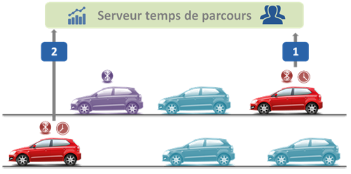 En détectant les signaux Bluetooth émis par les appareils embarqués ou portés dans les véhicules, ces capteurs permettent de mesurer le temps que mettent les usagers à parcourir un tronçon donné, sur la base d’identifiants anonymisés et horodatés. L’analyse de ces données, centralisée sur un serveur et recueillies lors des différents passages du véhicule à proximité des balises, permet de déterminer son Temps de Parcours Individuel (TPI). La statistique de ces TPI permet ensuite d’évaluer périodiquement les temps de parcours moyens sur les différents tronçons.